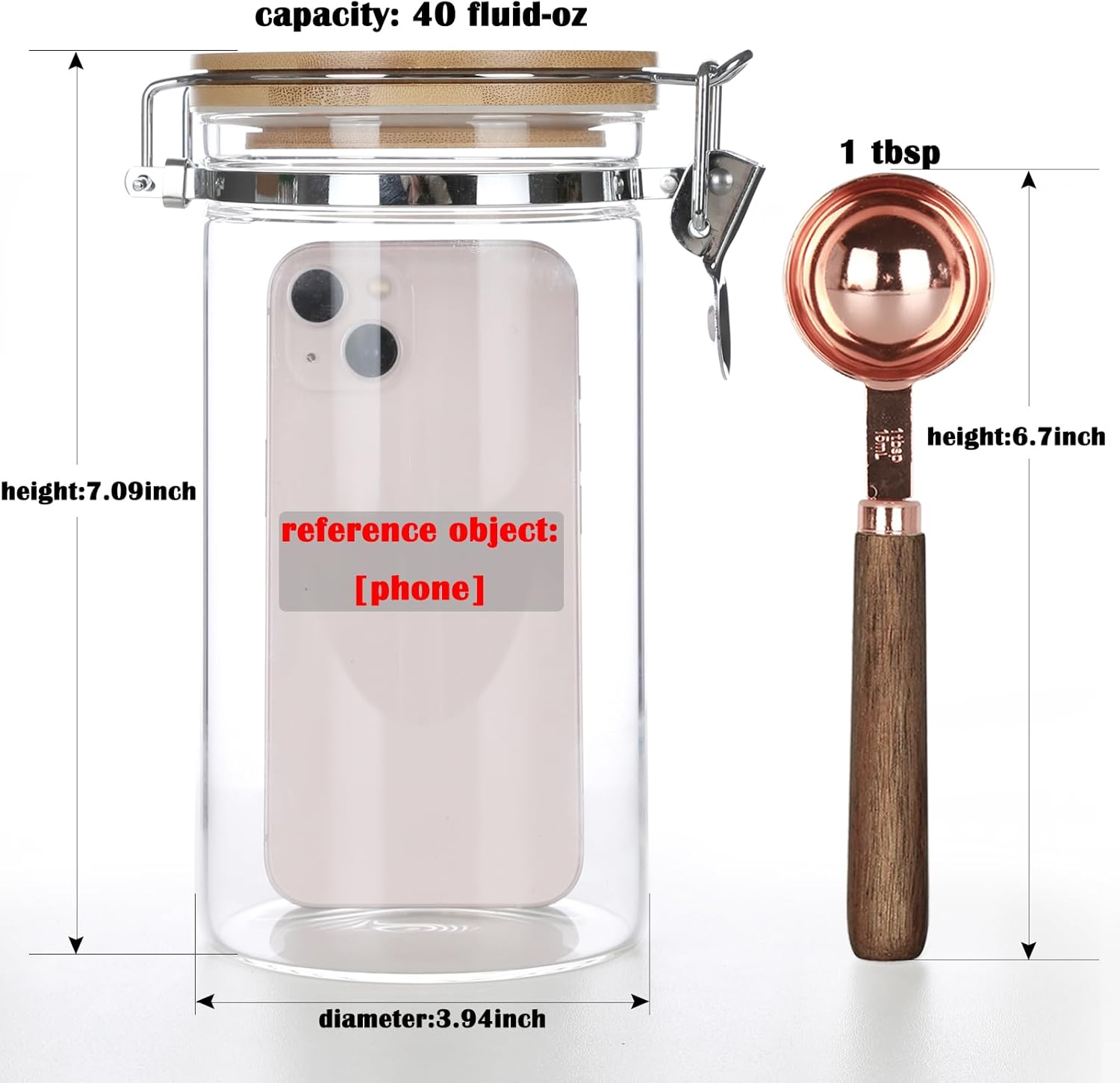 - Complete Set Includes:1 glass sealed jars (Height 7″ x Diameter 3.9″,Capacity:40floz/1200ml),1 wooden handle coffee scoop(1 TBSP) and label stickers.