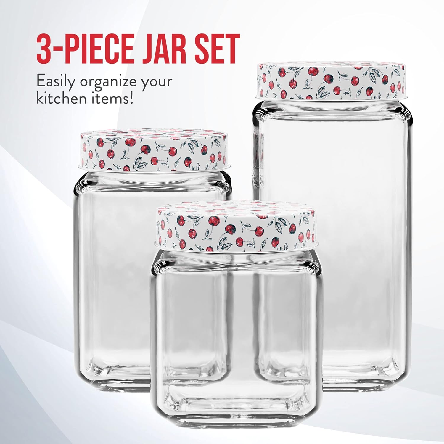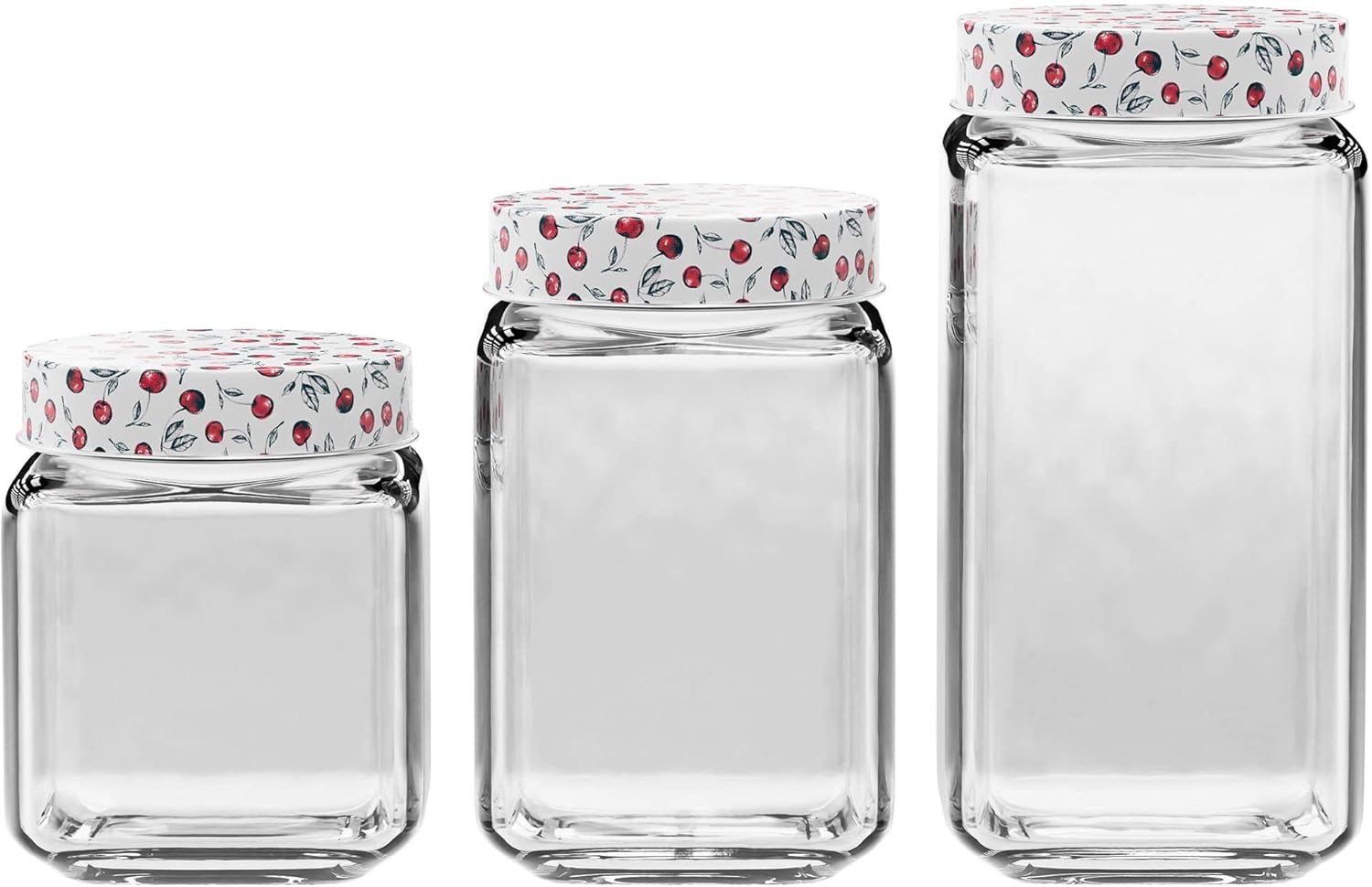 Clear Glass Jars | Set of 3 | Cherry Design on Airtight Lid | Food Storage Containers | Square | For Coffee, Beans, and Dry Goods | 45, 63, and 74-Ounce Capacity | Dishwasher Safe