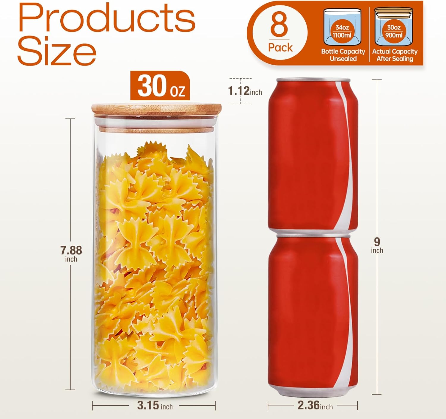 - Large Capacity Glass Jars with Bamboo Lids Set of 8: Glass containers with bamboo lids set of 8, 8x Large: 3.15 x 7.87 inch [about 30 floz], great for pasta, coffee, oats, cereal, flour, sugar, rice, candy, cookies, nuts, teas, etc. With 3.15″ wide mouth design, you can easily refill with any type of foods
